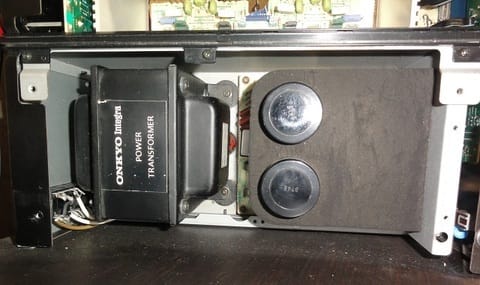 | 電源部は、他と構造的に分離されています。 トランスは重さ5KgのEIトランス、高級機に使われているトロイダルトランスではありませんが、電源を入れた瞬間、蛍光灯が一瞬消えます。それくらい、パワーがあると勝手に思ってます。 ブロック電コンは15,000μFが2本。最近の高級アンプは中~大容量のコンデンサを10本前後並列接続して使ってるものが多いようだ。 |