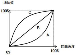 ボリュームがBカーブを使ってる場合は抵抗値がリニアな部分がほとんどだが、Aカーブの場合は抵抗値がリニアな部分はあまりない。